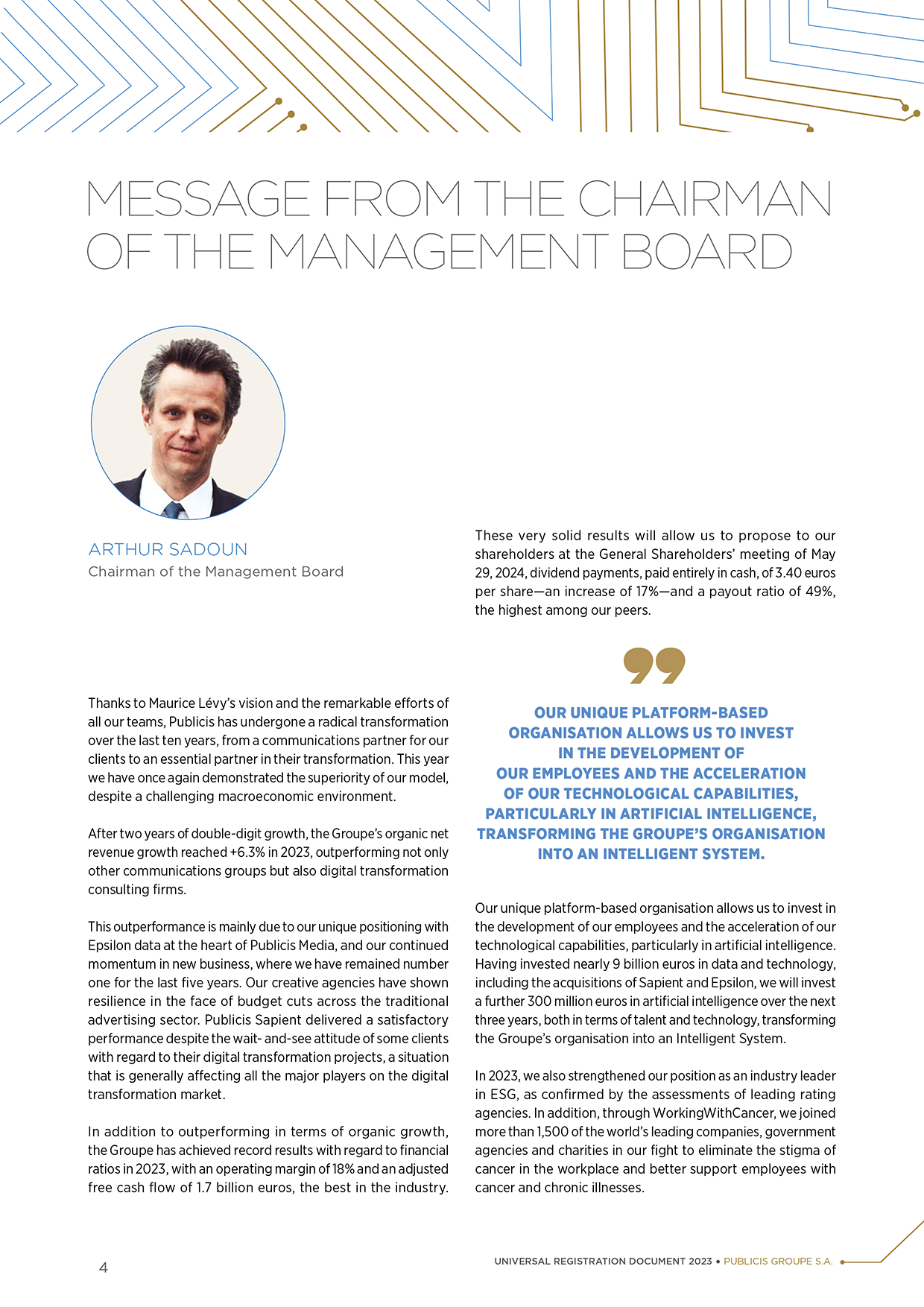 At the beginning of 2017, the Publicis Groupe Supervisory Board appointed Arthur Sadoun as Maurice Lévy’s successor as Chairman of the Management Board. Since June 1, 2017, Maurice Lévy has been a member of the Supervisory Board, which he now chairs.